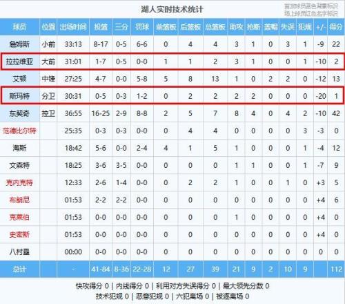 东契奇42分7板8助4断、詹姆斯22分4板3助、艾顿13分13板1助2帽、海斯12分5板1助、文森特9分1助、布朗尼6分、克内克特5分2板1助、拉拉维亚2分2板3助、斯玛特1分2板2助2断